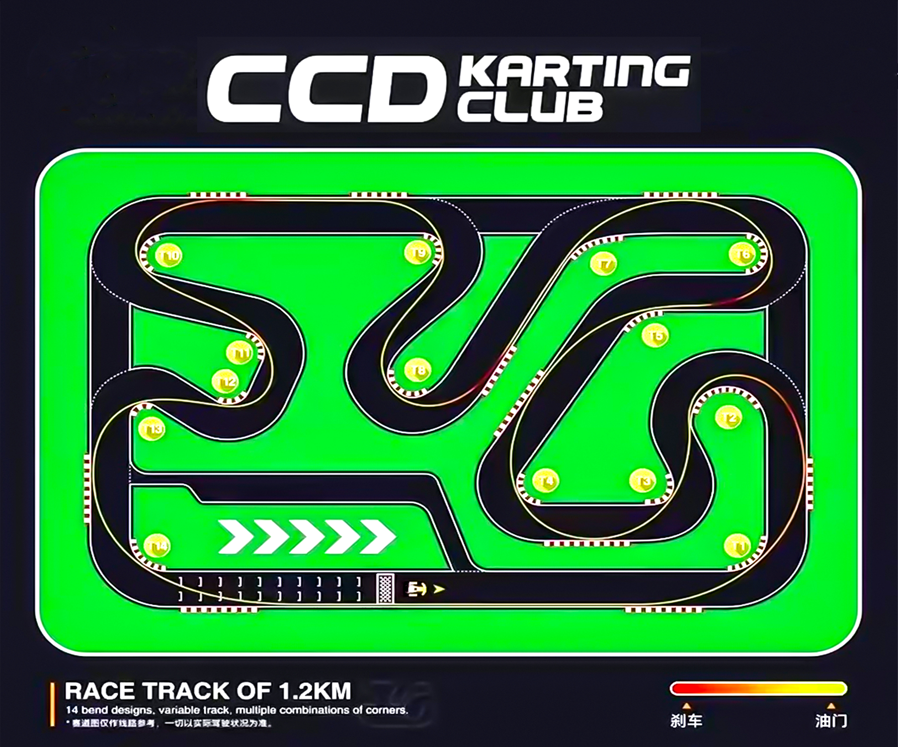 A professional asphalt track measuring 1.2km with 14 challenging turns